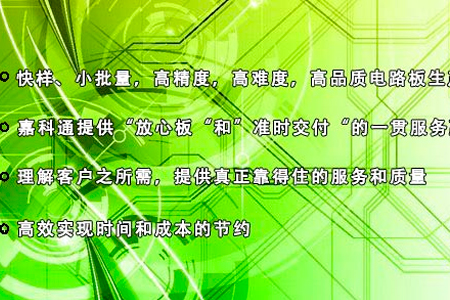 嘉科通成立于2008年,是頂尖的快樣及批量電路板制造商,專業(yè)生產(chǎn)高精密雙面、多層及阻抗、盲埋孔、厚銅線路板。公司擁有先進(jìn)的設(shè)備和一批高端線路板生產(chǎn)技術(shù)人才,掌握著行業(yè)先進(jìn)的產(chǎn)品生產(chǎn)工藝和擁有強(qiáng)大的產(chǎn)品技術(shù)開(kāi)發(fā)團(tuán)隊(duì)。 嘉科通提供“放心板”和“準(zhǔn)時(shí)交付”的一貫服務(wù)贏得了市場(chǎng)的好評(píng)。產(chǎn)品被廣泛使用在通信,醫(yī)療器械,工控產(chǎn)品,安防產(chǎn)品,工業(yè)設(shè)備,測(cè)試儀器,汽車,計(jì)算機(jī)周邊產(chǎn)品,電子消費(fèi)品以及大專院校等科技領(lǐng)域. 嘉科通被愛(ài)默生、同洲科技、比亞迪、美的評(píng)為“優(yōu)秀供應(yīng)商”。同時(shí),我們還和國(guó)外的許多知名品牌有著戰(zhàn)略伙伴關(guān)系。在市場(chǎng)上,成功的建立了“JKT” 品牌。嘉科通工作日可以加工190多款快速樣單, 60%是多層板。月產(chǎn)量6000多平米。