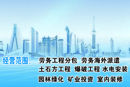 公司經(jīng)營(yíng)范圍:勞務(wù)工程分包、勞務(wù)海外派遣(指東南亞國(guó)家、中東國(guó)家) 、房建分包、公路工程、鐵路工程、隧道橋梁勞務(wù)清包、土石方工程、爆破工程、水電安裝、普通貨物運(yùn)輸、邊坡支護(hù)、孔樁施工、園林綠化、礦業(yè)投資、室內(nèi)裝修,隧道勞務(wù)清包