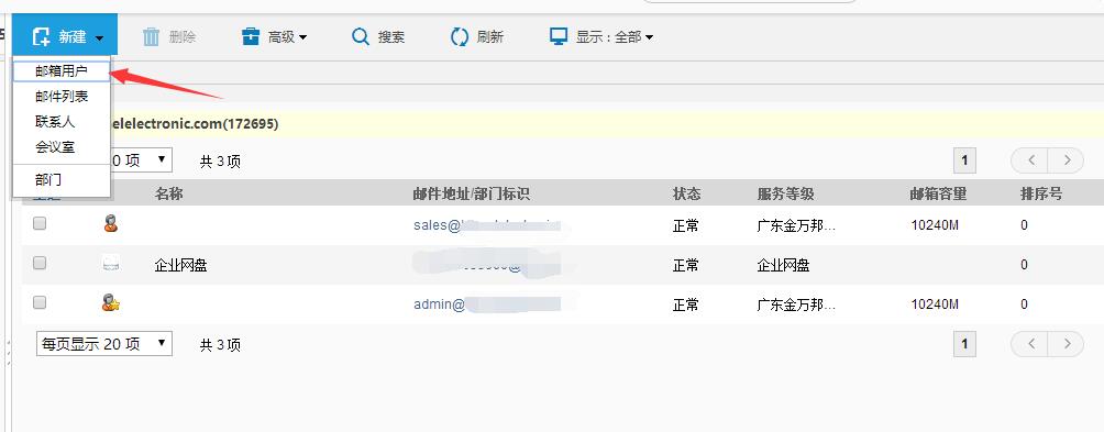 3.在右側(cè)點(diǎn)擊新建>>郵箱用戶