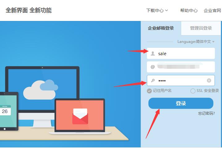 5.登陸子郵箱,進(jìn)入郵箱登陸口,選擇企業(yè)郵箱登陸>>在用戶名輸入剛建立的郵箱前綴sale,然后輸入密碼,等級(jí)登陸即可