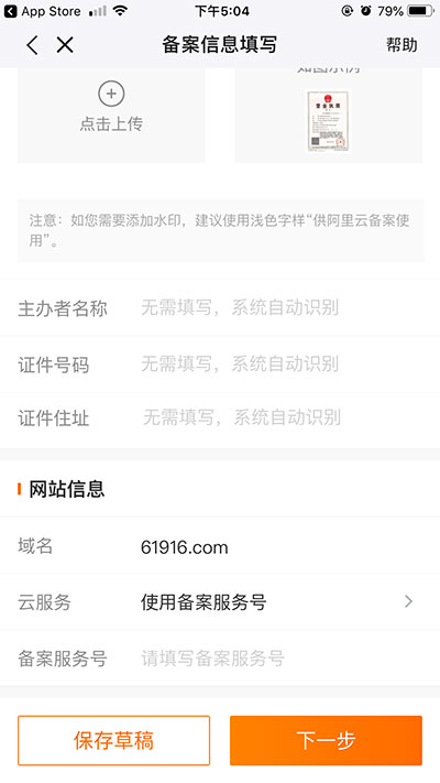 填寫網(wǎng)站域名》云服務(wù)選擇使用備案服務(wù)號》備案服務(wù)號找我司購買》點擊下一步