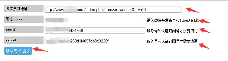5.在微信token輸入小于32位任意英文數(shù)字,在appid輸入剛剛上面復(fù)制的開(kāi)發(fā)者id,在secret輸入剛剛上面復(fù)制的開(kāi)發(fā)者密碼,最后點(diǎn)擊確認(rèn)無(wú)誤提交